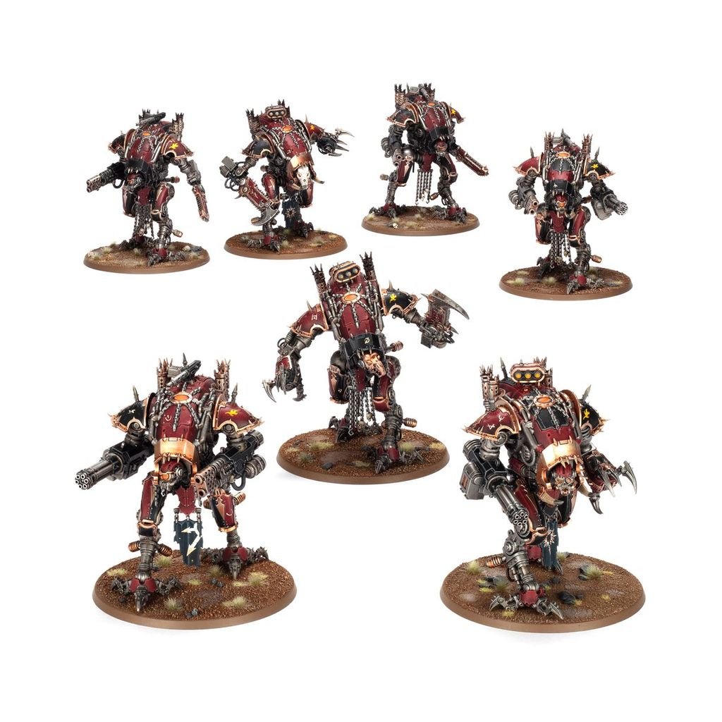 - Folosește acest set de plastic din mai multe piese pentru a asambla șapte War Dogs pentru armatele tale Chaos Knights în jocurile Warhammer 40,000.
