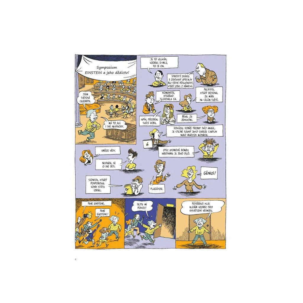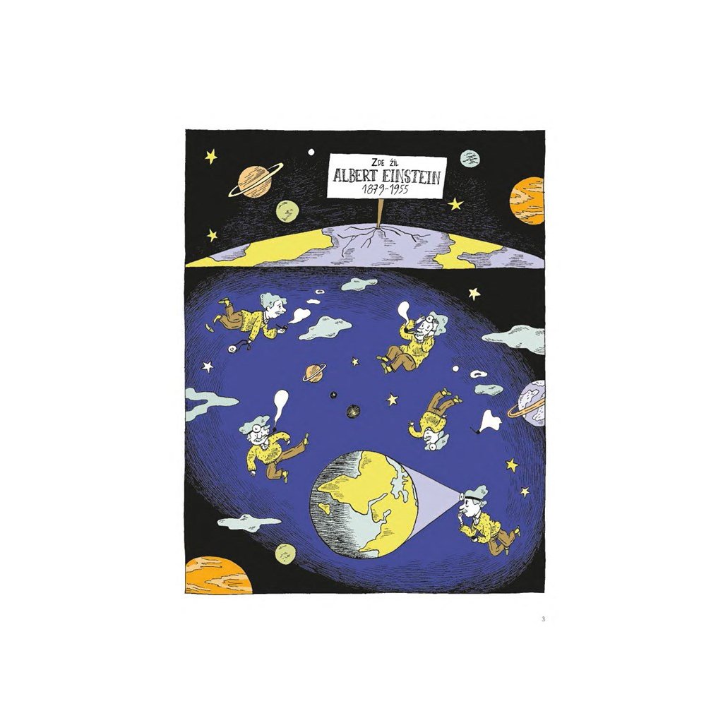 Banda desenată educativă, destinată copiilor și adolescenților, spune povestea vieții și a descoperirilor lui Albert Einstein, ilustrând în același timp grafic, într-o formă ușor de înțeles, principalele sale teorii științifice din domeniul fizicii care ne-au schimbat radical viața. În prima biografie comică a acestui geniu al secolului XX, îl urmărim pe fizician de la naștere până la sfârșitul vieții. Descoperim un copil irepresibil, interesat de știință și de geometrie, mai târziu un student la Școala Politehnică din Zurich care îi întâlnește pe marii oameni de știință ai timpului său și, în cele din urmă, un om de știință de succes a cărui carieră a fost încununată de crearea relativității speciale și apoi generale. Dar îl întâlnim și pe Albert Einstein, îngrozit de aplicațiile militare ale cercetărilor sale științifice și copleșit de viața de familie. O bandă desenată perfect scrisă, care surprinde viața lui Einstein în toată complexitatea ei.