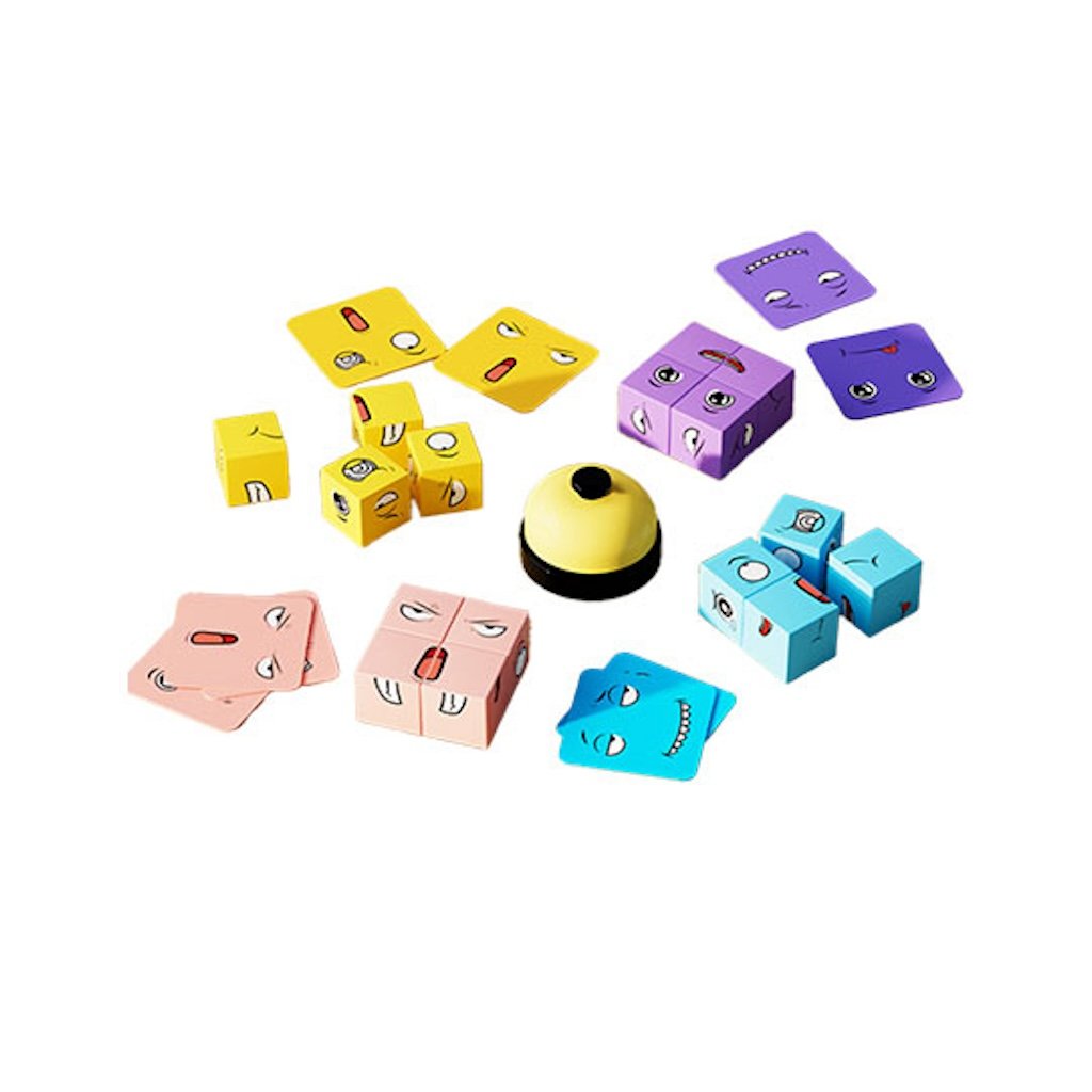 - Dezvăluirea cărții de joc dezvăluie o față amuzantă pe carte. Apoi, fiecare jucător trebuie să își creeze fața cât mai repede posibil prin rotirea și răsucirea cuburilor lor.