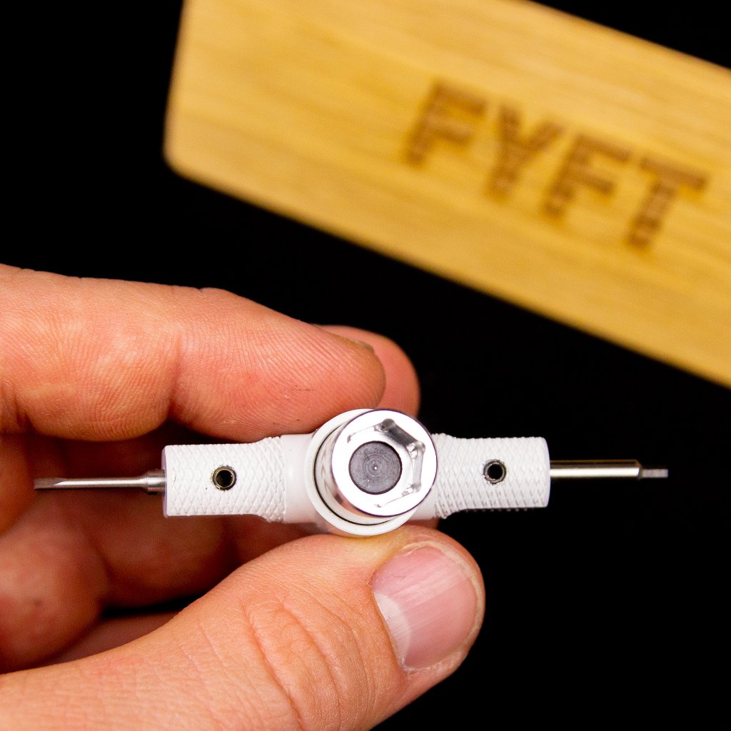 - Există două șurubelnițe detașabile pe axa perpendiculară, în special o șurubelniță Allen de 1,5 mm și o șurubelniță cu cap plat.