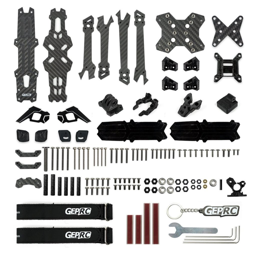 - În plus față de cadru, în pachet veți găsi și un set de curele pentru baterii și piese imprimate 3D, de exemplu, pentru montarea camerelor de acțiune, suport pentru antenă, suport pentru unitatea O3 Air, suport pentru camera anti-vibrații DJI O4, etc.