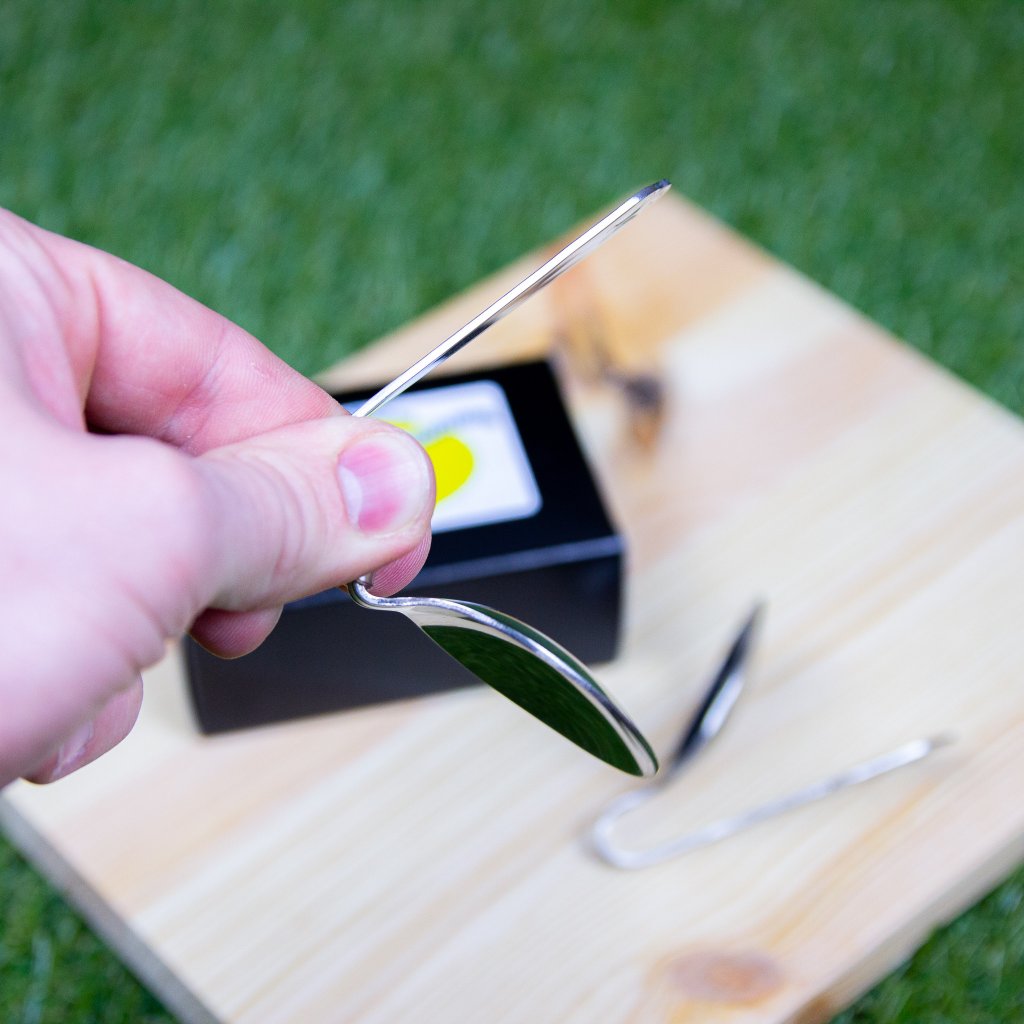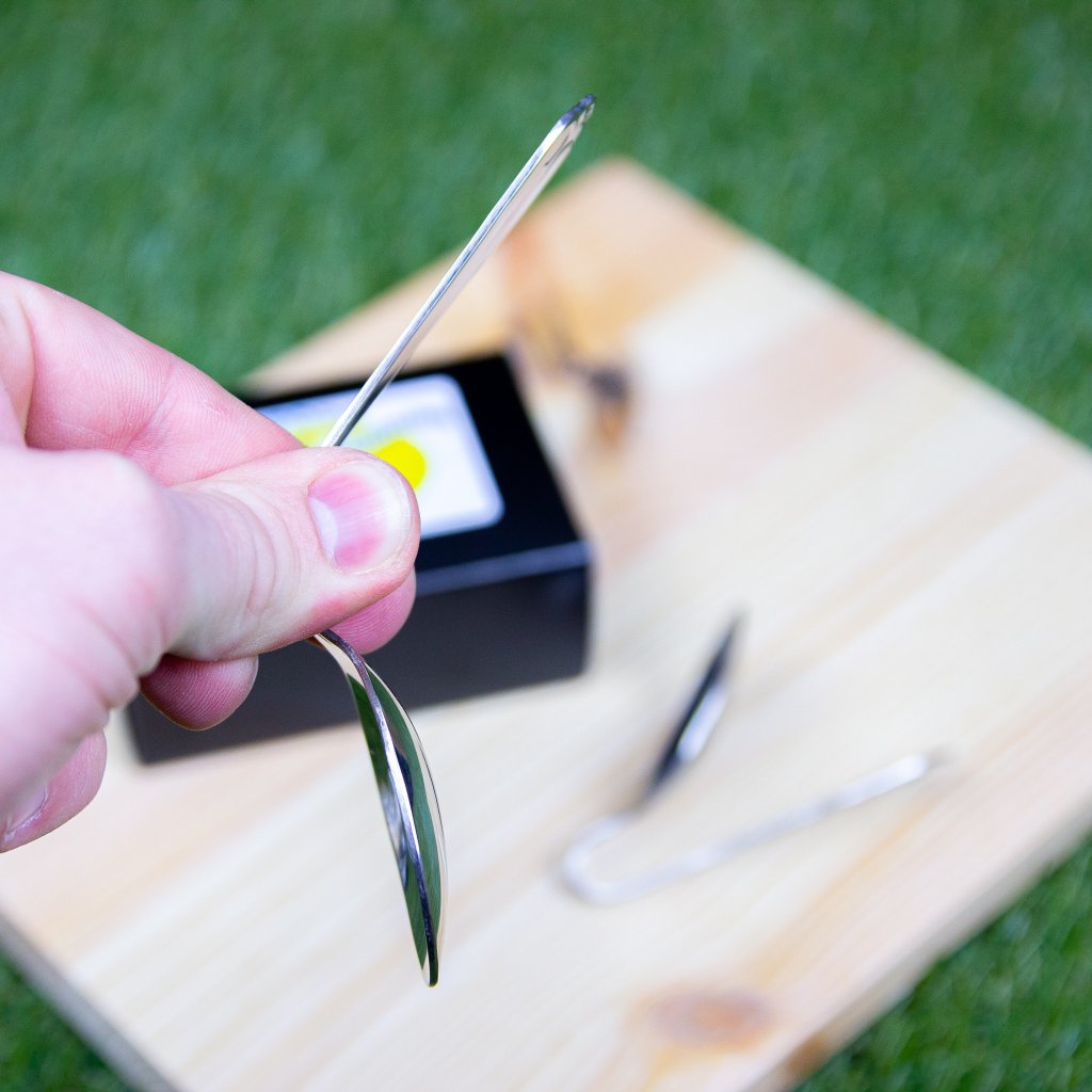 - Scoți în fața publicului o lingură care arată ca o lingură clasică pe care ai luat-o din bucătăria de acasă. O ții între degete și ea începe să se îndoaie într-un "U".