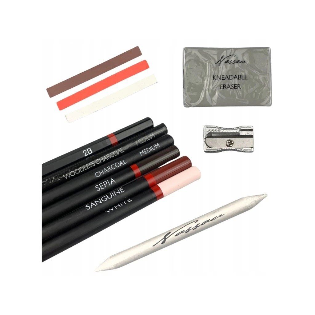 - Trusa acoperă tehnicile de bază de schițare - cărbune, cretă pastel și creion 2B clasic.