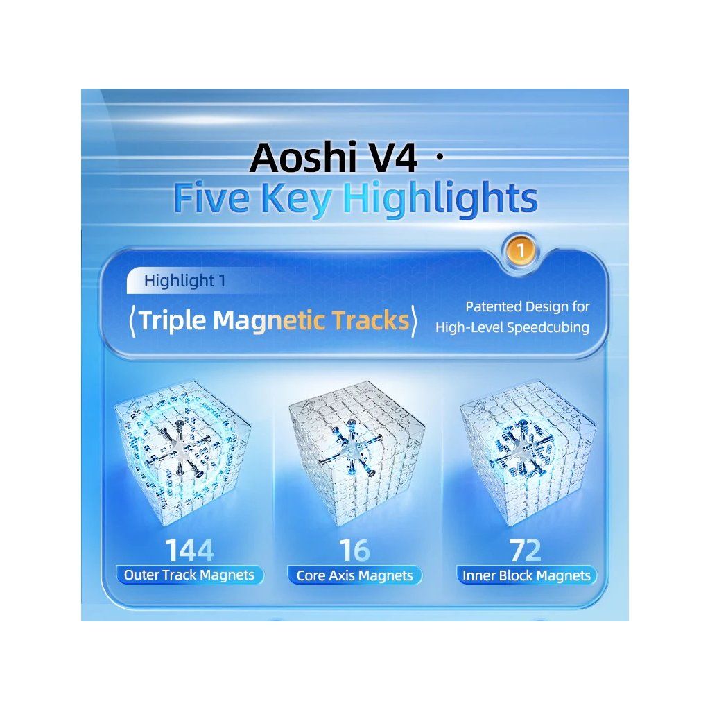 - Cubul se bazează pe seria populară Aoshi și aduce designul modernizat pe care MoYu l-a aplicat cu succes versiunilor sale 4×4, 5×5 și 7×7.