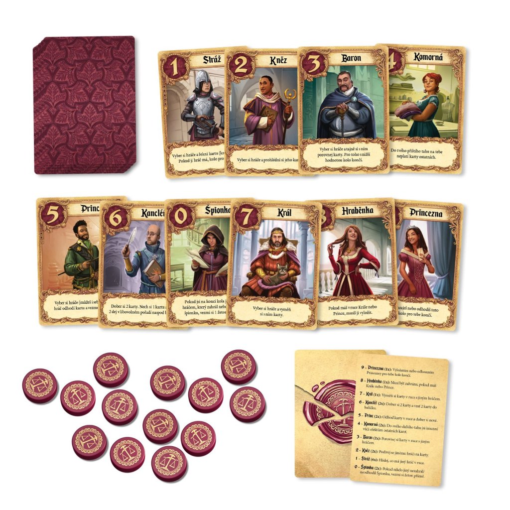 Livrează cele mai multe scrisoriJocul se joacă pe mai multe runde câștigătoare - adică scrisori livrate. Tu ții cartea unei persoane care transportă o scrisoare pentru prințesă, iei o a doua carte în timpul turei tale și apoi pui una dintre cele două deoparte. Există 8 tipuri de cărți în total, iar fiecare are o abilitate diferită (un preot se poate uita la cartea unui adversar etc.). |