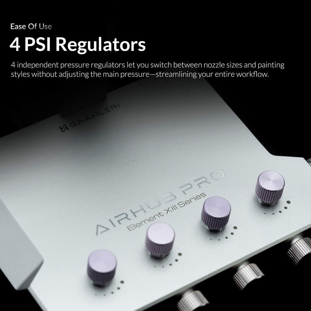 - Suportul este prevăzut cu regulatoare de presiune pentru fiecare dintre cele patru aerografe, permițând o muncă mai ușoară.