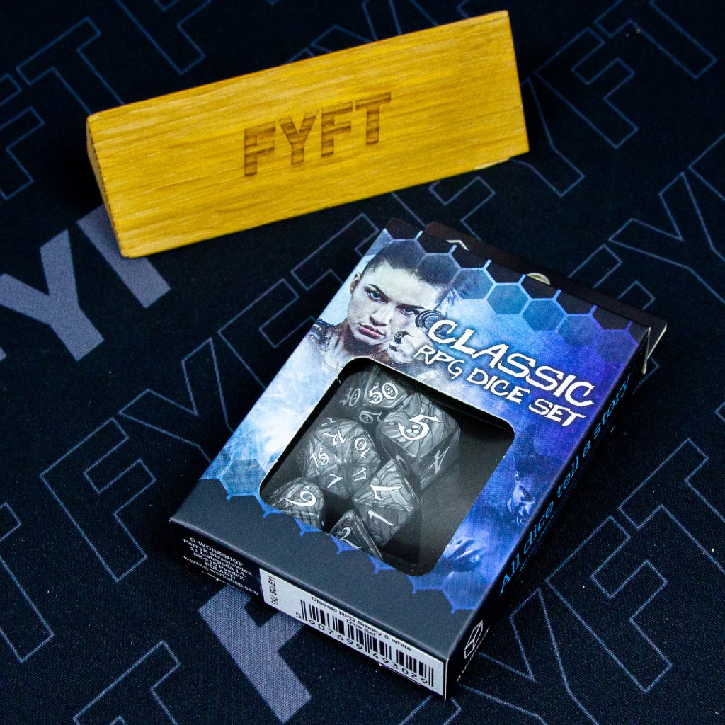 - Un set de zaruri poliedrice realizate din cele mai bune materiale într-un design clasic elegant pentru a-ți ajuta eroii să exploreze temnițe, să lupte cu dragoni și să găsească calea potrivită de aventură.