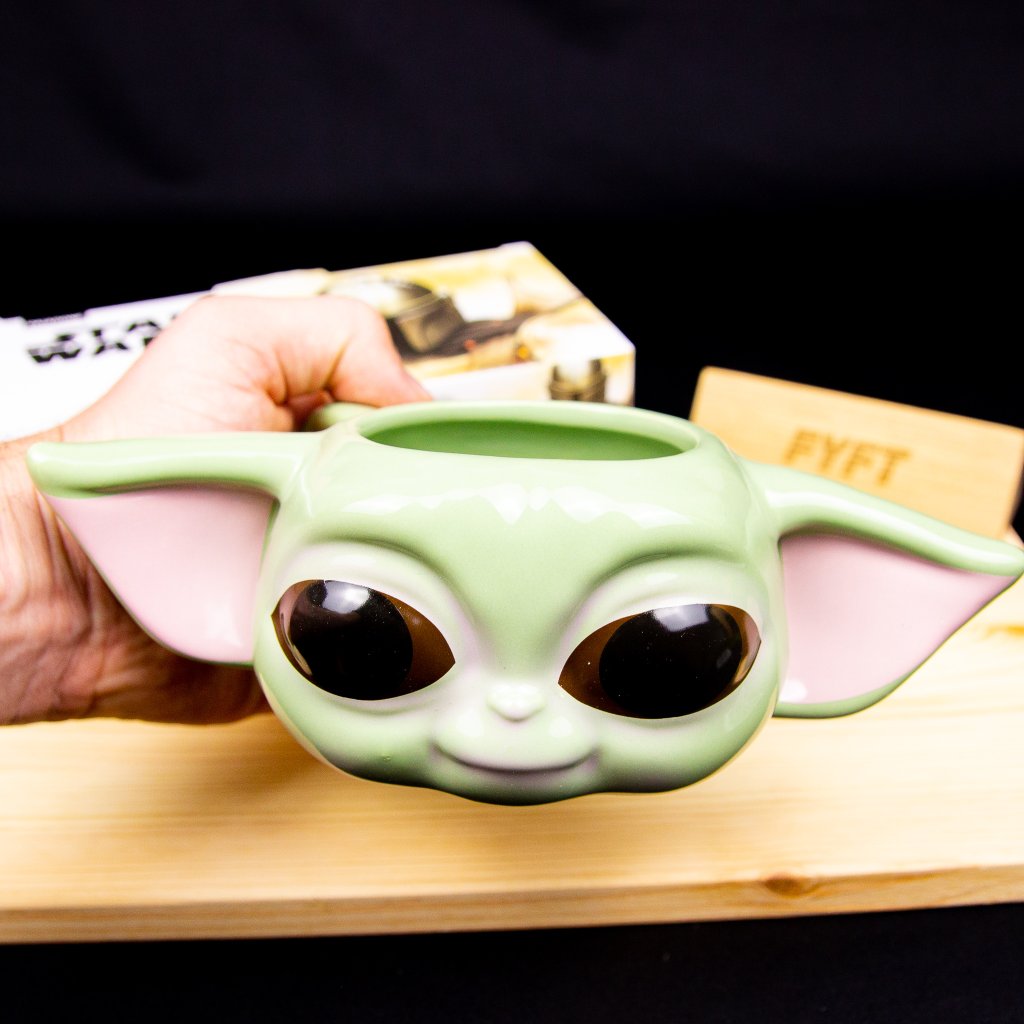 - O cană elegantă în forma lui Baby Yoda aka Grog aka Copilul.