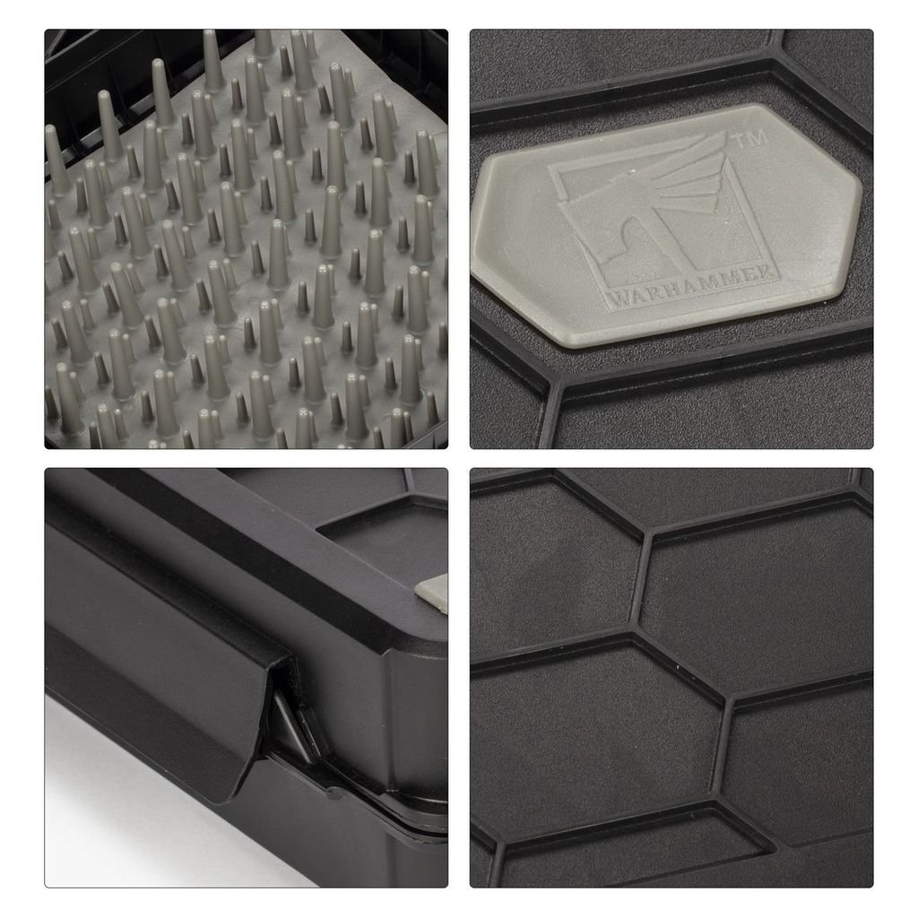 - Nu este nevoie să vă ocupați de sculptarea spumei, carcasa este căptușită cu peri de silicon care fixează ferm miniaturile în loc.